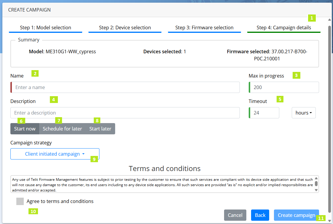 After Selecting Model, Selecting Devices and Selecting Firmware it is possible to schedule or start the campaign to change the firmware in the devices selected. To schedule / start a Campaign: