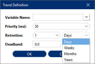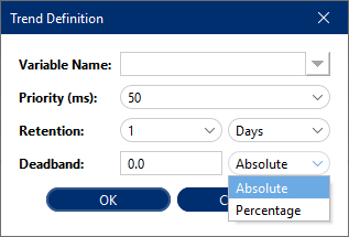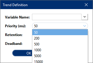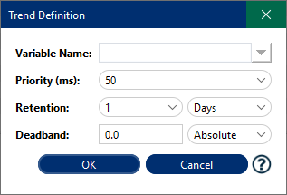 The configuration parameters are:Parameter Description Variable Name The source Variable Name. Priority(ms) The Priority defines the frequency (ms), that the device variable are read. Retention This option defines a schedule of the life-cycle of the Variable Data. Through its definition it is possible to set how many days, weeks, months or years will be the life-cycle of a Variable Data. Deadband The minimum value change required to record a variation of data. Prevents logging small insignificant variations.