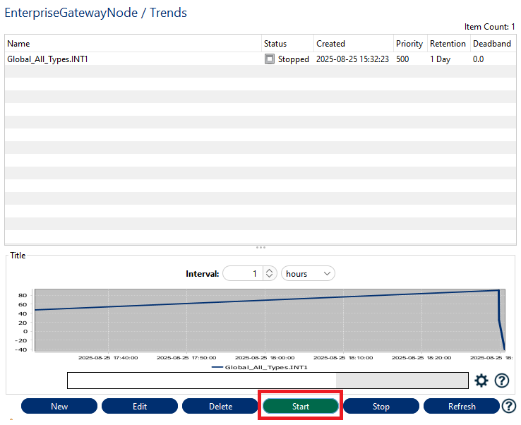 To start, click the button "Start" at the bottom left, on the Trends pane, the trending status will then be changed to "Started". It is also possible to right-click the specific Variable and choose the Start option on the list that opens.