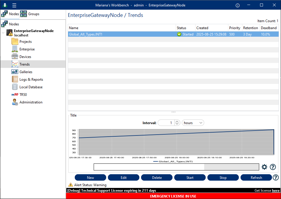 When you select the Data Trending icon from the Workbench left hand pane, the Trends window appears in the right hand pane with a table showcasing all of the current trends and a row of buttons of possible actions.