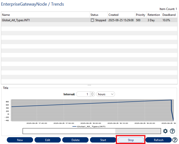 To stop the Data Trending, click the second button from the bottom left, on the Trends pane, which says "Stop". The trending status will then be changed to "Stopped".