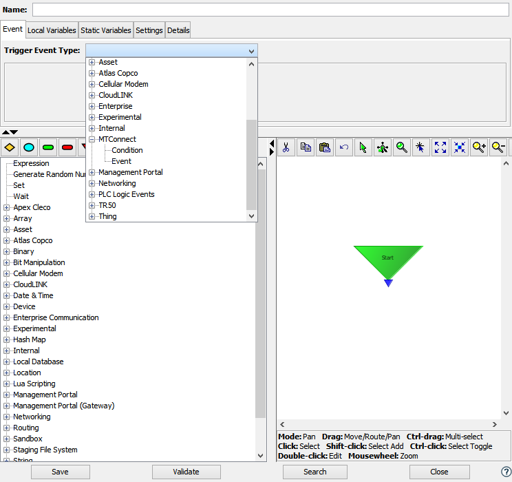 The MTConnect category is available in the Trigger Event Type list when defining or editing a trigger. This example shows a new trigger being defined with the Canvas Editor: