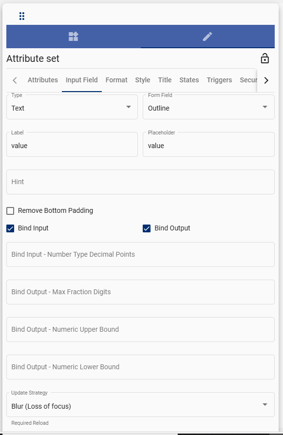 The Update Strategy, sets the way data changes will be detected, if by a rapid Change or Blur (Loss of Focus).
