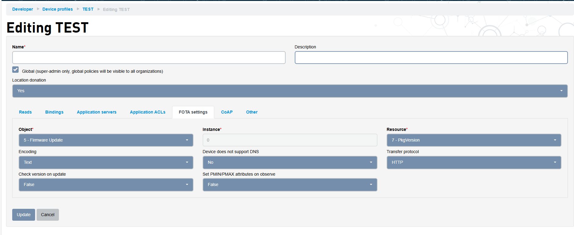 The FOTA settings tab is used to configure FOTA (Firmware over the Air) settings