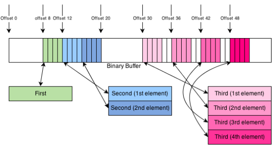 This example shows the JSON description of the variables and the placement of the data as it is read from the source binary buffer.