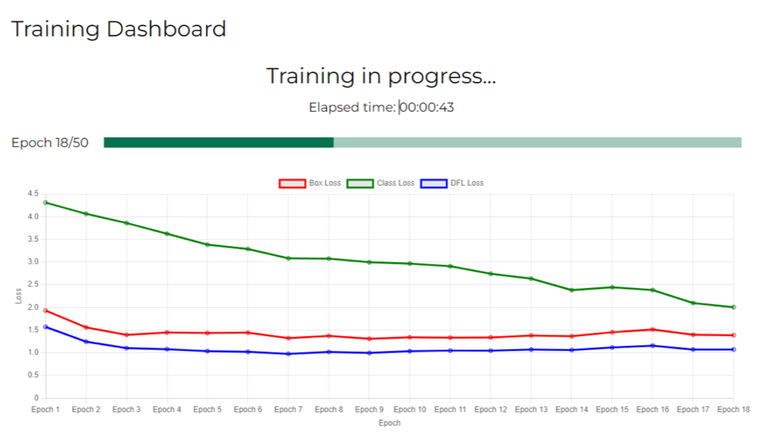 The Training Dashboard offers information in real-time, providing transparency on metrics like accuracy, loss and validation results.
